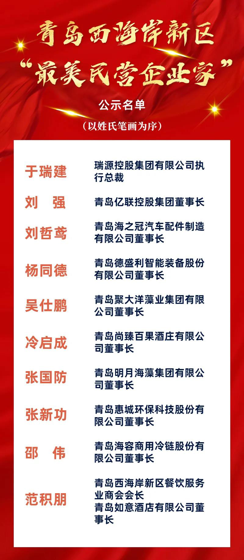 近日,工委區委統戰部、工委區委宣傳部、區工商業聯合會(區民營經濟發展局)聯合開展青島西海岸新區“最美民營企業家”評選活動。經過廣泛宣傳發動、優秀典型推薦、綜合評價、聯合評分等程序,評選出10名青島西海岸新區“最美民營企業家”,青島惠城環保科技股份有限公司董事長、總經理張新功入選。