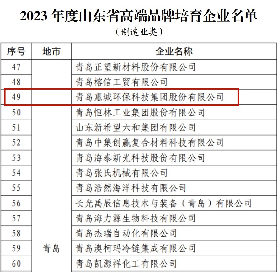 日前,山東省市場監督管理局公布了“2023年度山東省高端品牌培育企業”名單,青島惠城環保科技集團股份有限公司榜上有名。
